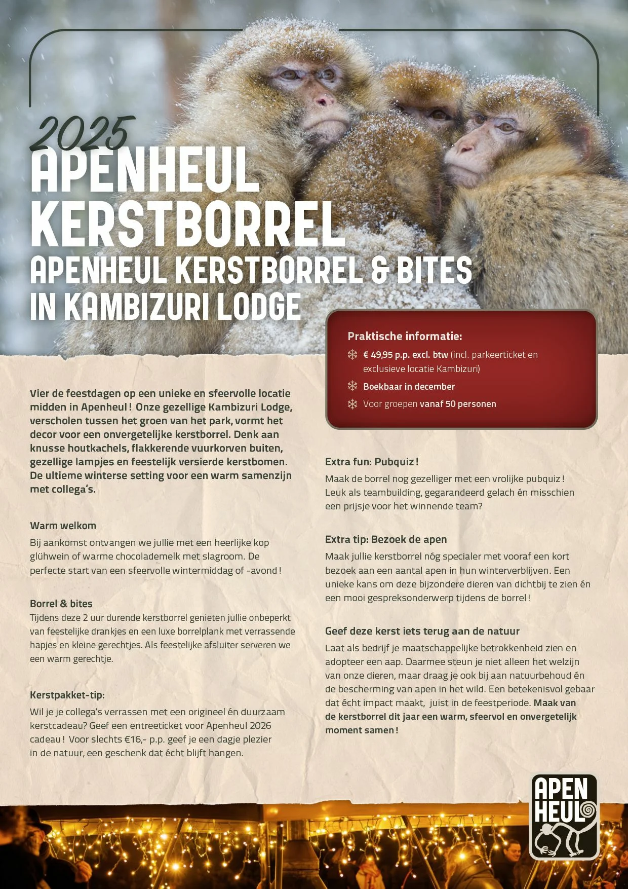 Maak jullie kerstborrel nóg specialer met vooraf een kort bezoek aan een aantal apen in hun winterverblijven. Een unieke kans om deze bijzondere dieren van dichtbij te zien én een mooi gespreksonderwerp tijdens de borrel!