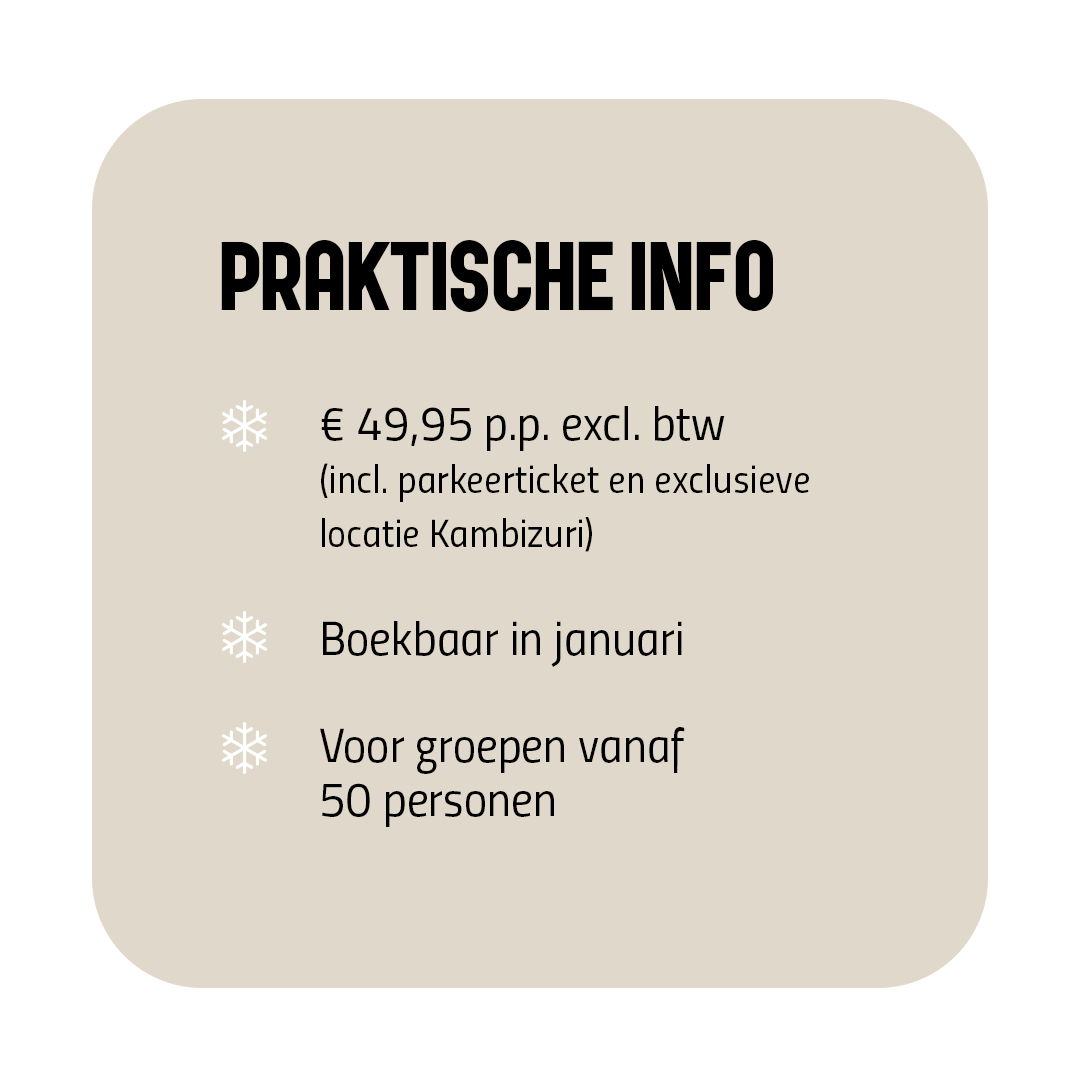 - €49,95 p.p. excl. btw (incl. parkeerticket en exclusieve locatie Kambizuri)