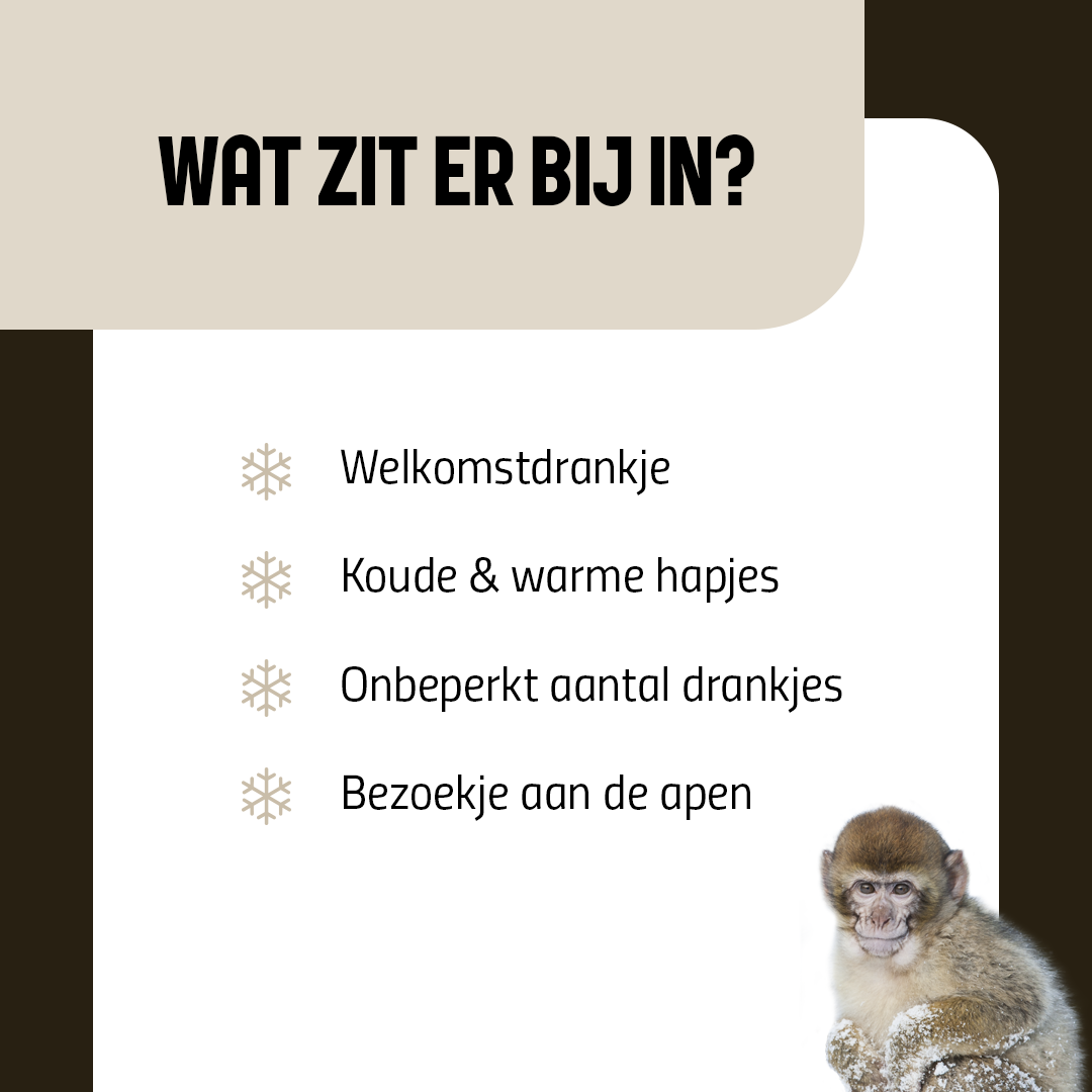 Maak jullie nieuwjaarsborrel nóg specialer met vooraf een kort bezoek aan een aantal apen in hun winterverblijven. Een unieke kans om deze bijzondere dieren van dichtbij te zien én een mooi gespreksonderwerp tijdens de borrel!