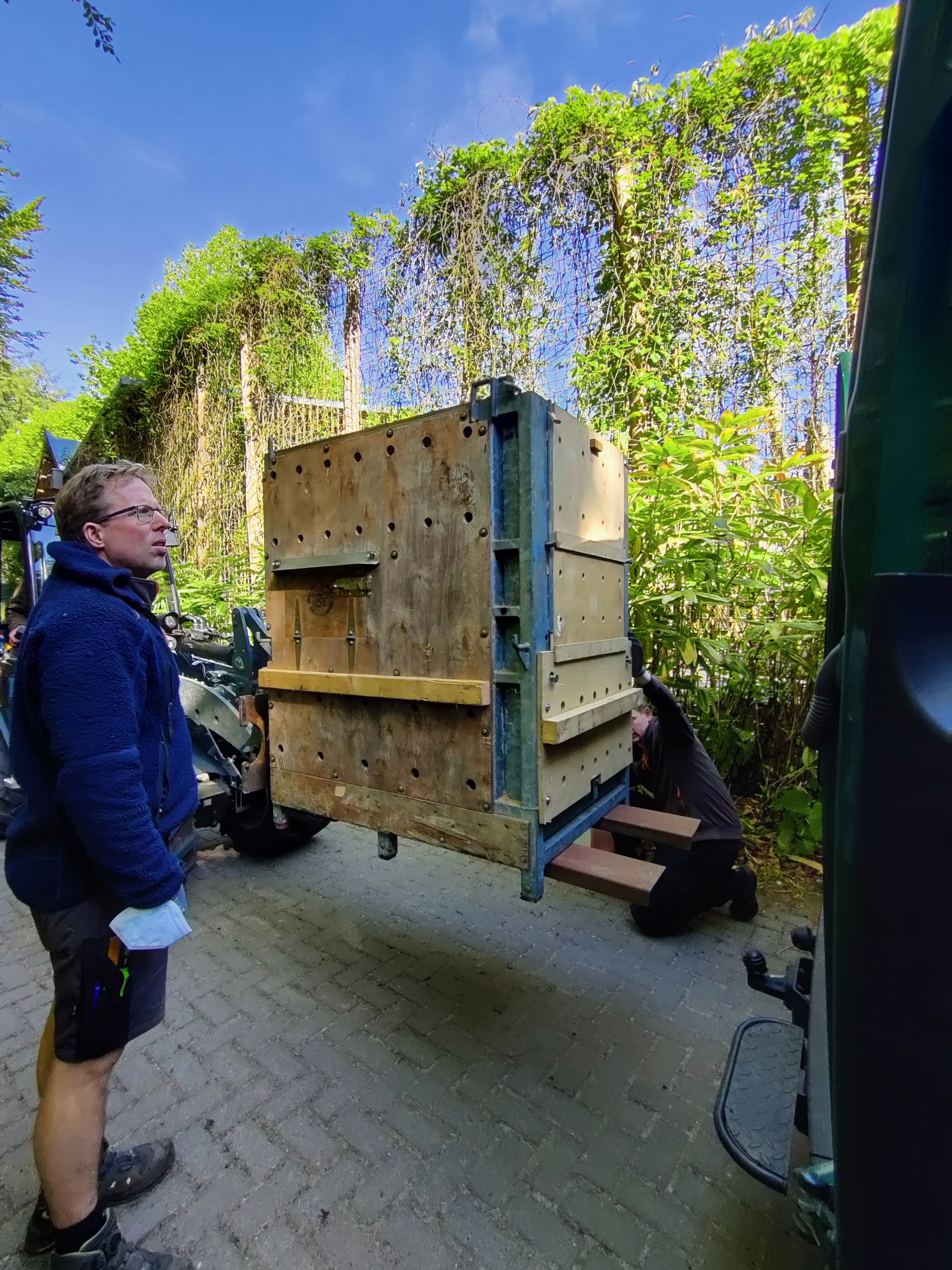 Ook de collega’s van de Technische Dienst zijn betrokken bij de verhuizing. Zij zorgen voor een veilige en stevige transportkist. Per diersoort moet zo’n transportkist aan bepaalde eisen voldoen, maar wij passen de inrichting daarna ook nog aan naar de behoefte van het dier. In het geval van Baju: een stuk brandslang aan het plafond van de kist, zodat hij zich kan vasthouden tijdens het transport.