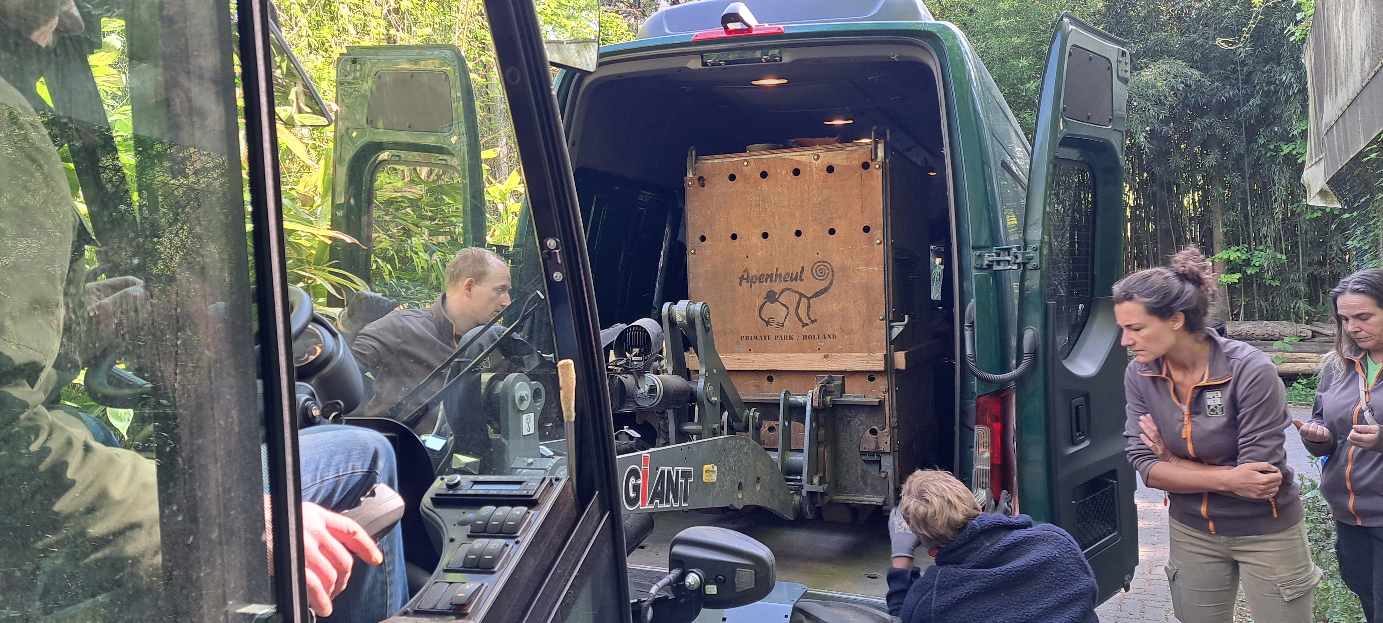 Daarna zetten we de kist met Baju met een heftruck in de mini-van die klaar staat. In de kist achterin het busje, nog op het terrein bij Apenheul, komt Baju bij uit de verdoving en controleert de dierenarts of hij goed wakker is. Het busje is geconditioneerd, zodat het klimaat onderweg altijd goed en stabiel is.