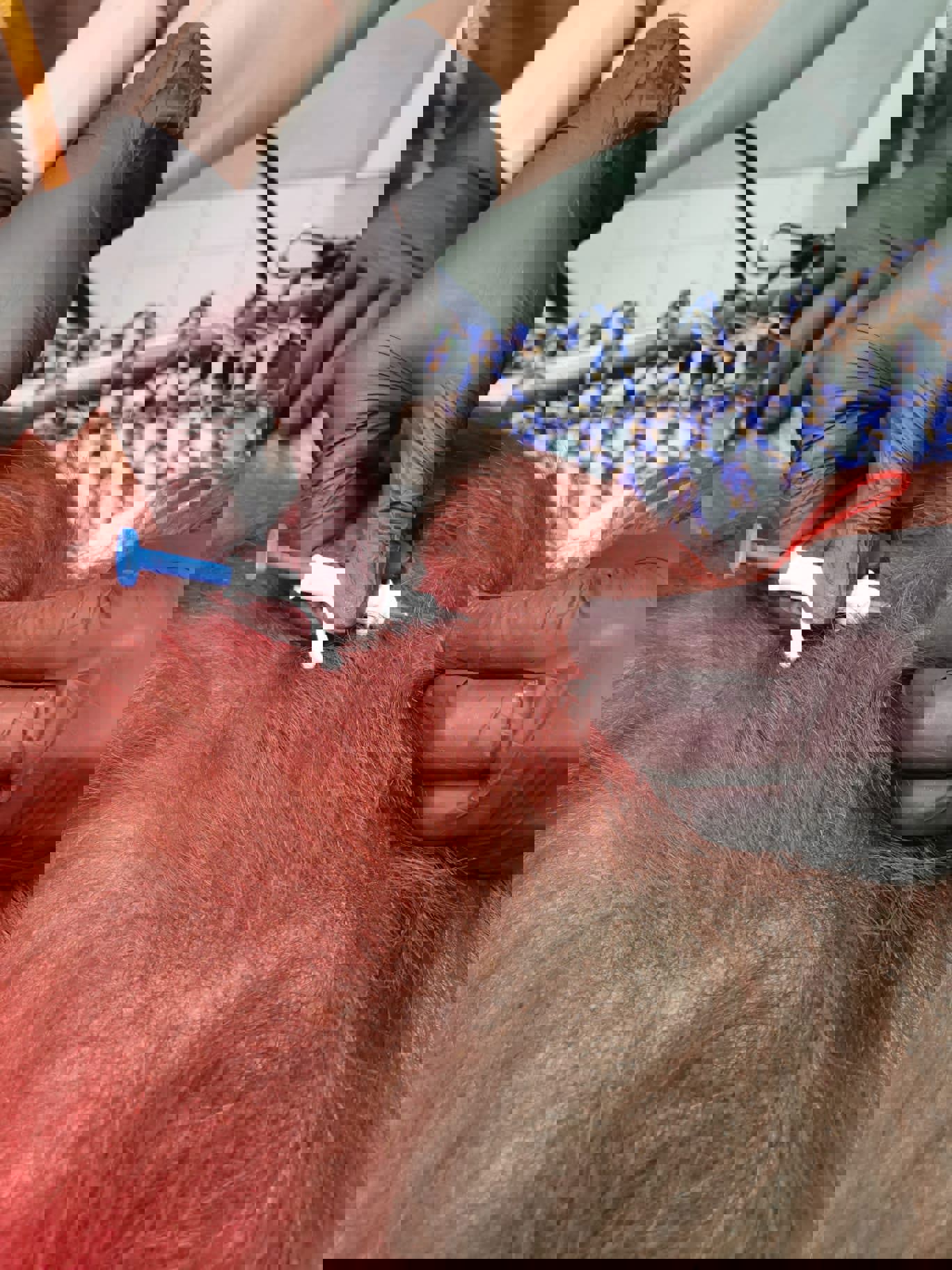 Onze dierenarts voert 2-4 weken voor vertrek meerdere onderzoeken uit. Denk hierbij aan bloedonderzoek, mestonderzoek en een tuberculose test. Zo weten we zeker dat Baju gezond is voordat hij verhuist. Handig: Baju is getraind op het aanbieden van zijn arm voor het afnemen van bloedmonsters.