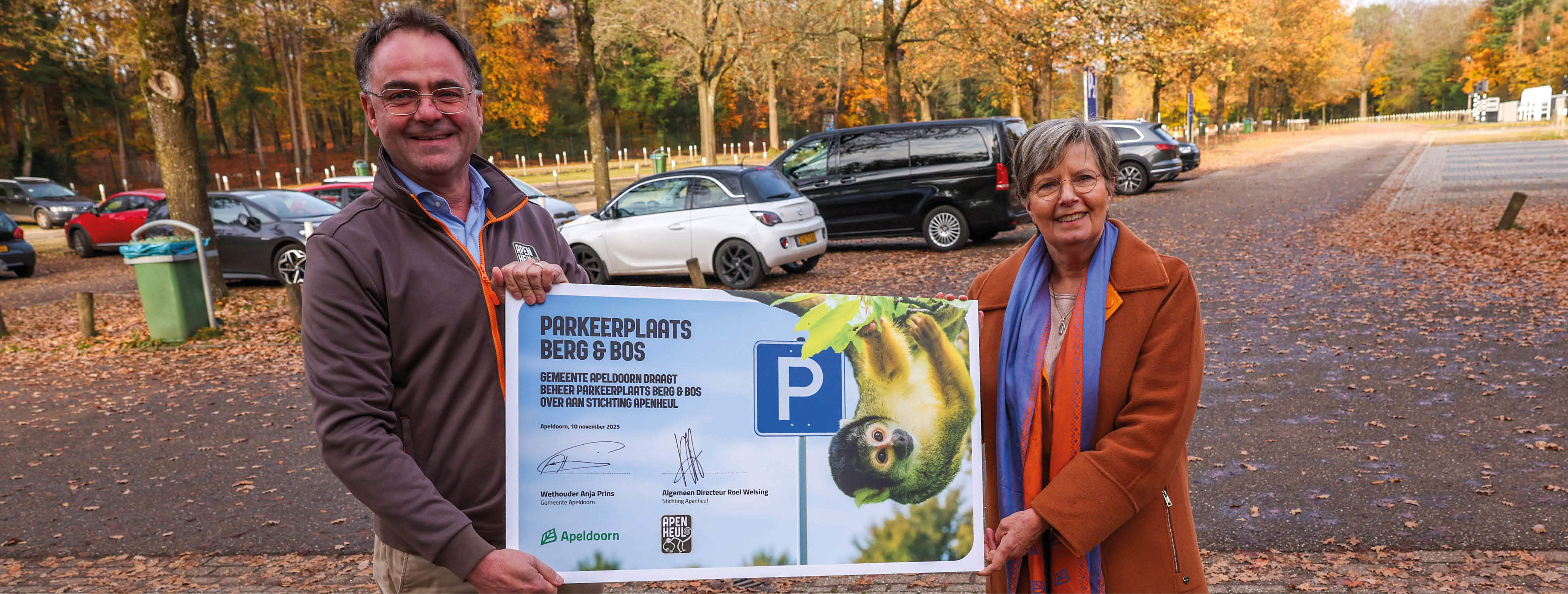 Directeur Roel Welsing van Apenheul en wethouder Anja Prins hebben 10 november hun handtekeningen gezet onder overeenkomsten waarmee het parkeerterrein van park Berg en Bos per 1 januari 2026 in erfpacht overgedragen wordt aan Apenheul. Ook gaat Apenheul vanaf 2026 het parkeren op het terrein zelf organiseren en beheren. Die taak lag voorheen bij Accres, die dit deed in opdracht van de gemeente.